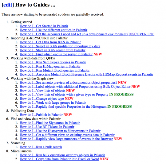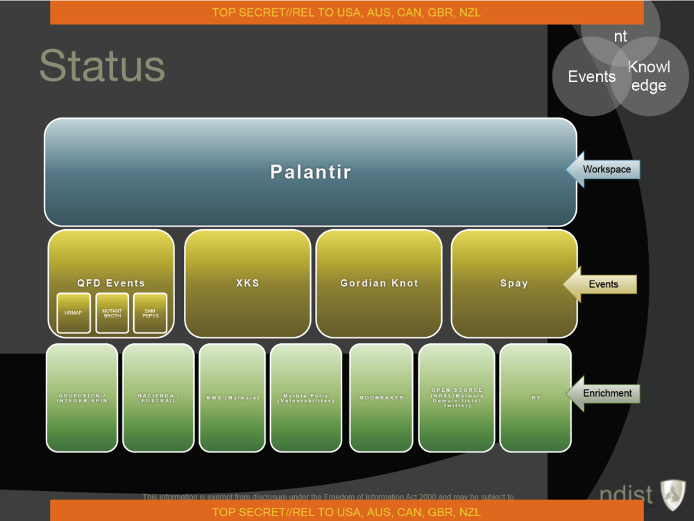 The GCHQ wiki includes links to classified webpages describing Palantir’s use by the Australian Defence Signals Directorate (now called the Australian Signals Directorate) and to a Palantir entry on the NSA’s internal “Intellipedia,” though The Intercept does not have access to copies of the linked sites. However, embedded within Intellipedia HTML files available to The Intercept are references to a variety of NSA-Palantir programs, including “Palantir Classification Helper,” “[Target Knowledge Base] to Palantir PXML,” and “PalantirAuthService.” (Internal Palantir documents obtainedby TechCrunch in 2013 provide additional confirmation of the NSA’s relationship with the company.)