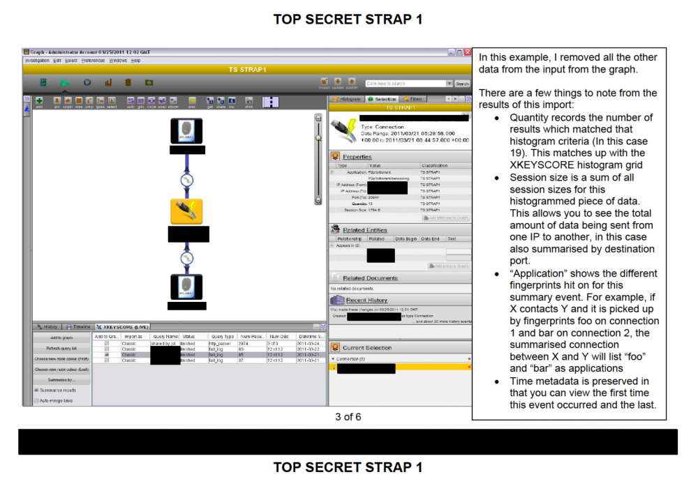 MAKING XKEYSCORE MORE intelligible — and thus much more effective — appears to have been one of Palantir’s chief successes. The helper tool, documented in a GCHQ PDF guide, provided a means of transferring data captured by the NSA’s XKEYSCORE directly into Palantir, where presumably it would be far easier to analyze for, say, specific people and places. An analyst using XKEYSCORE could pull every IP address in Moscow and Tehran that visited a given website or made a Skype call at 14:15 Eastern Time, for example, and then import the resulting data setinto Palantir in order to identify additional connections between the addresses or plot their positions using Google Earth.