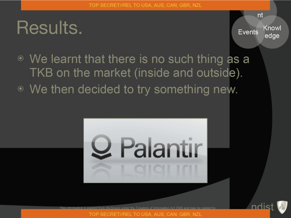 Above all, these documents depict Palantir’s software as a sort of consolidating agent, allowing Five Eyes analysts to make sense of tremendous amounts of data that might have been otherwise unintelligible or highly time-consuming to digest. In a 2011 presentation to the NSA, classified top secret, an NDIST operative noted the “good collection” of personal data among the Five Eyes alliance but lamented the “poor analytics,” and described the attempt to find new tools for SIGINT analysis, in which it “conducted a review of 14 different systems that might work.” The review considered services from Lockheed Martin and Detica (a subsidiary of BAE Systems) but decided on the up-and-comer from Palo Alto.