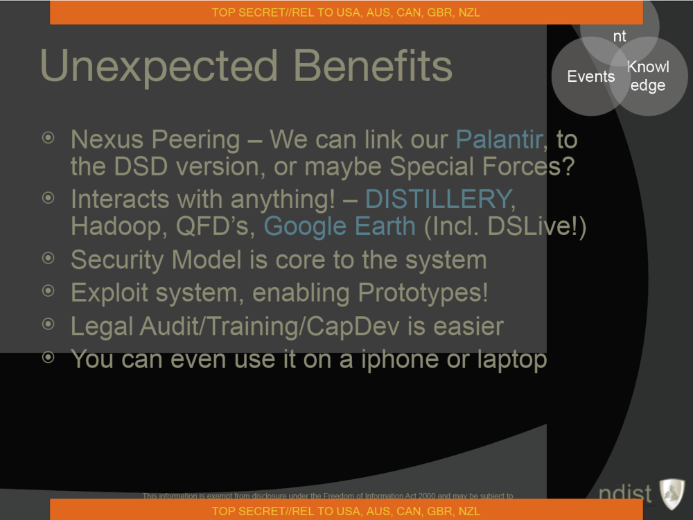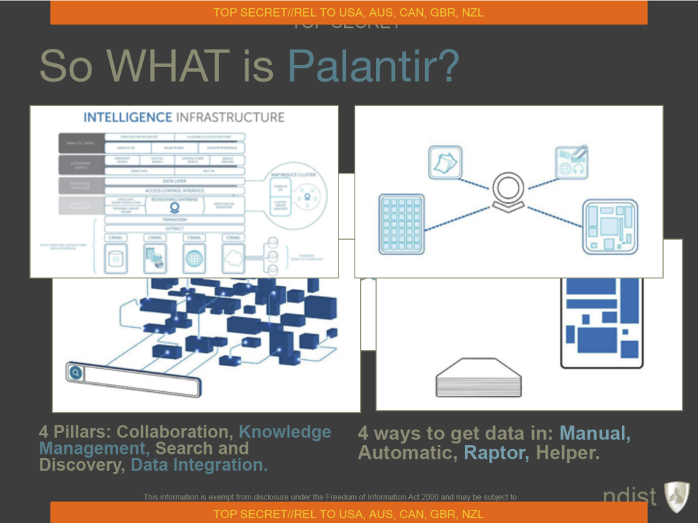 A 2011 PowerPoint presentation from GCHQ’s Network Defence Intelligence & Security Team (NDIST) — which, as The Intercept has previously reported, “worked to subvert anti-virus and other security software in order to track users and infiltrate networks” — mentioned Palantir as a tool for processing data gathered in the course of its malware-oriented work. Palantir’s software was described as an “analyst workspace [for] pulling together disparate information and displaying it in novel ways,” and was used closely in conjunction with other intelligence software tools, like the NSA’s notorious XKEYSCORE search system. The novel ways of using Palantir for spying seemed open-ended, even imaginative: A 2010 presentation on the joint NSA-GCHQ “Mastering the Internet” surveillance program mentioned the prospect of running Palantir software on “Android handsets” as part of a SIGINT-based “augmented reality” experience. It’s unclear what exactly this means or could even look like.